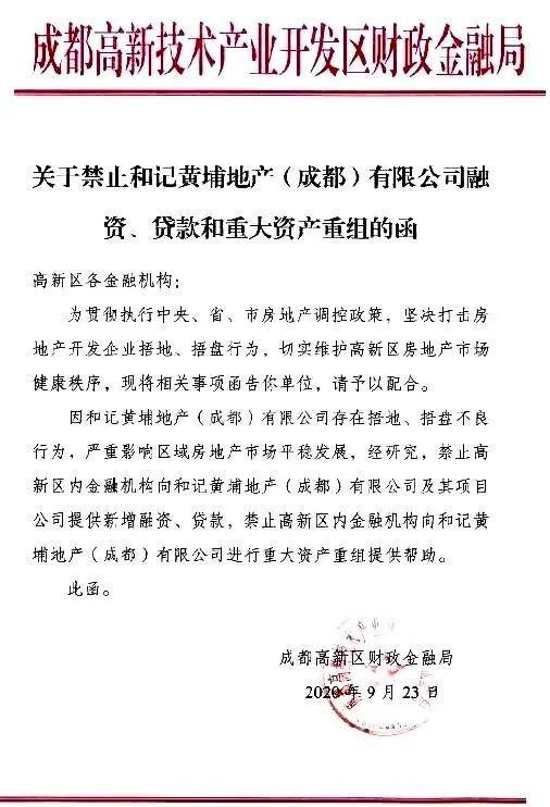 成都直接下发通知,要求禁止向和记黄埔地产(成都)有限公司提供新增融资、贷款,以及为其进行重大资产重组提供帮助。